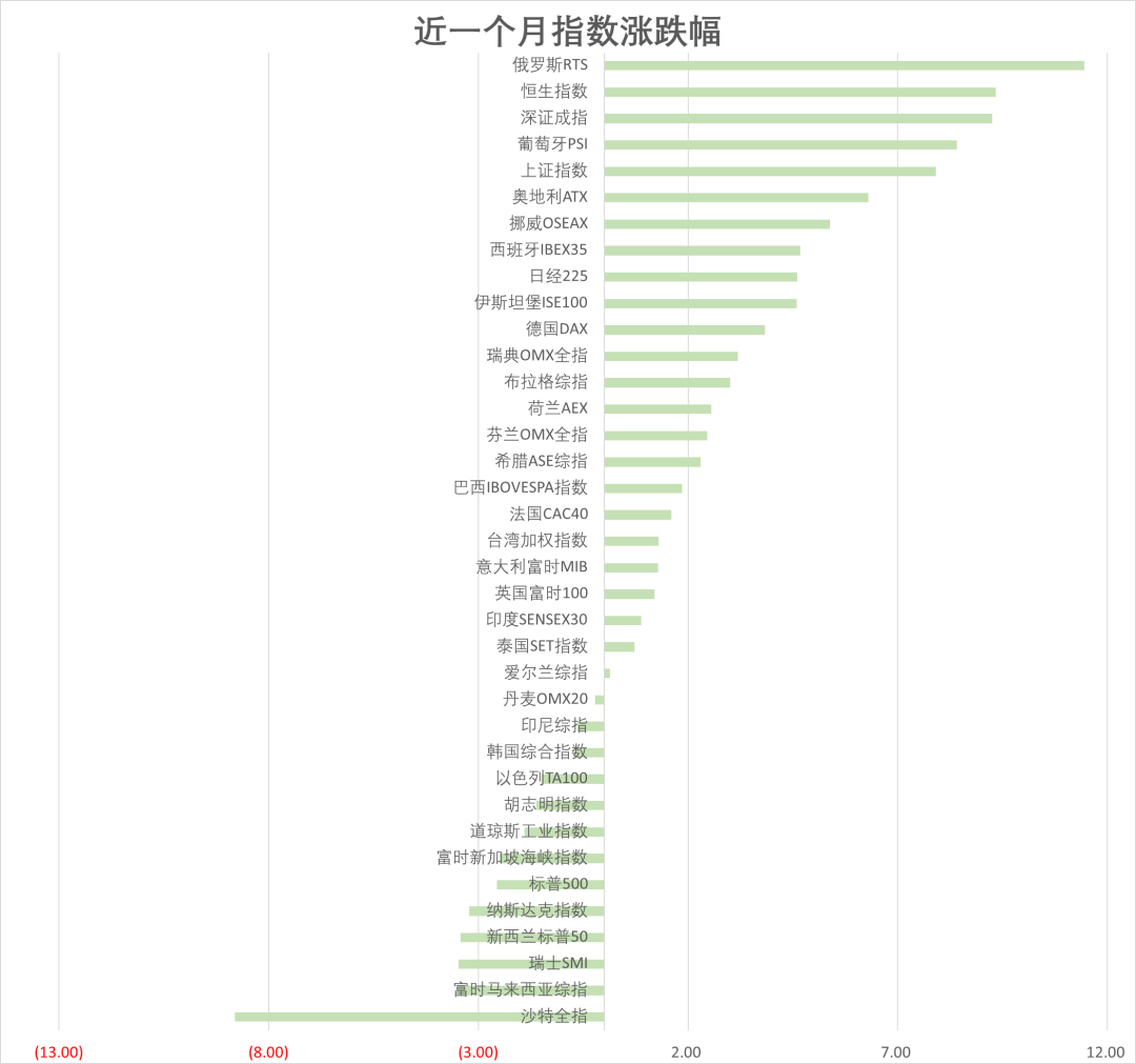 最近一個月,俄羅斯RTS指數(shù)上漲11.45%,恒生指數(shù)上漲9.33%,深證成指上漲9.26%,占據(jù)了全球主要股指漲幅榜前三的位置。