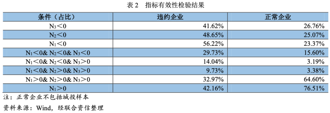 上表數(shù)據(jù)顯示,①近六成的違約企業(yè)違約前一年的指標(biāo)值為負(fù),同時(shí),76.51%的非城投正常企業(yè)最近一年的指標(biāo)值為正,說明指標(biāo)在違約企業(yè)和正常企業(yè)(非城投企業(yè))間有一定的區(qū)分度。如果企業(yè)指標(biāo)值為負(fù),則應(yīng)針對企業(yè)個(gè)體情況提高指標(biāo)精確度,進(jìn)一步核查其到期債務(wù)償還能力。②在違約時(shí)點(diǎn)的預(yù)測上,在違約前一年指標(biāo)為負(fù)的樣本中,42.31%(占全部樣本的23.77%)的違約企業(yè)指標(biāo)在違約前兩年出現(xiàn)了由正轉(zhuǎn)負(fù)的情況,即一旦指標(biāo)由正轉(zhuǎn)負(fù),企業(yè)可能將在1~2年內(nèi)違約。