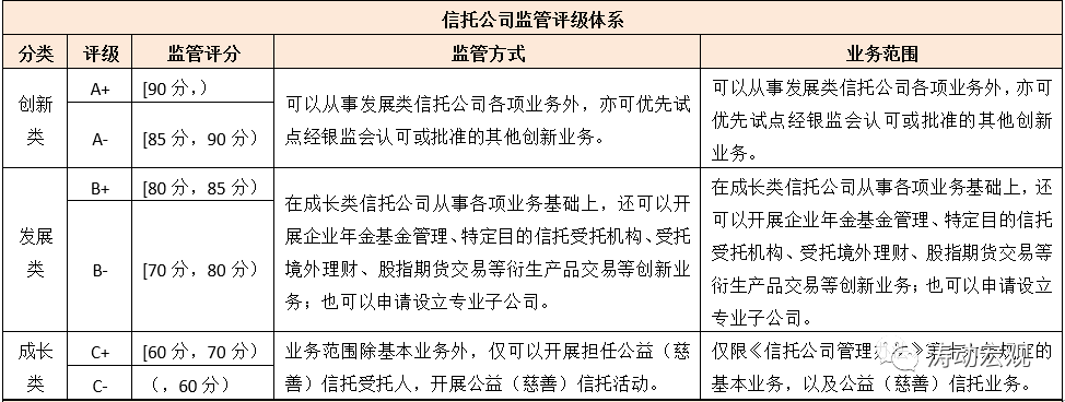 第三,信托公司的監管評級主要分為創新類、發展類和成長類三個大類,并進一步按照A、B、C分為六檔,通常情況下只有評級結果在B-及以上的信托公司才能稱之為良好。