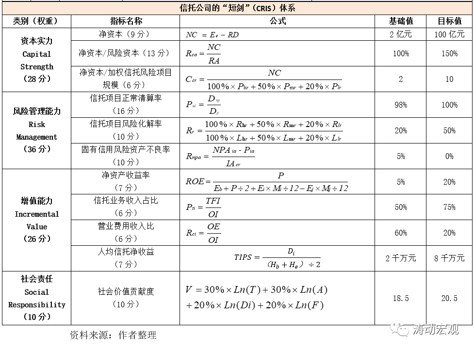 (1)中國信托業協會于2015年4月正式啟動《信托公司行業評級指引(試行)》及配套文件起草工作, 2016年試行推動形成所謂的“短劍”(CRIS)體系,該體系涵蓋四大板塊、11個指標,具體包括資本實力板塊(Capital Strength)、風險管理能力板塊(Risk Management)、增值能力板塊(Incremental Value)、社會責任板塊(Social Responsibility)。