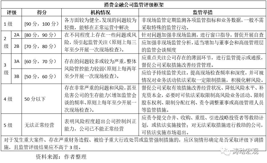2、消費金融公司的監管評級得分滿分為100分,具體分為五個等級。其中,2級和3級又進一步可分為A和B兩個檔次,而數值越大,表示機構風險或問題越大,需要監管關注的程度越高。