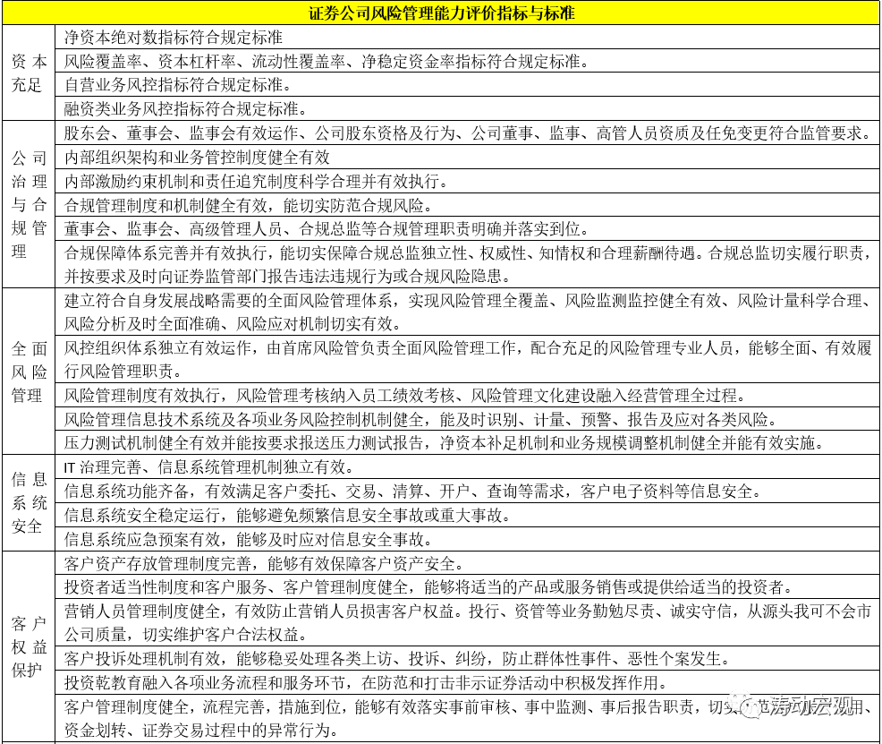 4、風險管理能力是證券公司評價體系的基礎,主要包括資本充足、公司治理與合規管理、全面風險管理、信息系統安全、客戶權益保護、信息披露等方面。