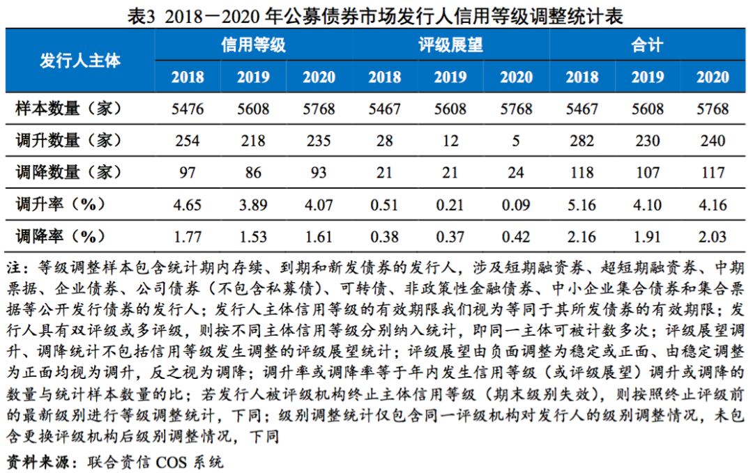 等級調整方面,發行人信用等級調整率變化不大,整體仍呈調升趨勢;企業性質方面,國有企業調整率同比上升,民營企業調整率同比下降,弱資質民營企業信用風險持續出清,存量發行人整體信用狀況有所改善,而國有企業信用風險出現一定程度分化,部分國有企業違約風險開始暴露;行業和地區方面,部分行業信用風險出現分化,等級調整無明顯地域特征;此外,大跨度評級調整數量有所減少。信用等級遷移方面,截至2020年末AAA級、AA+級發行人占比進一步上升,各級別穩定性整體表現良好,AA+級至A+級呈向上遷移趨勢。