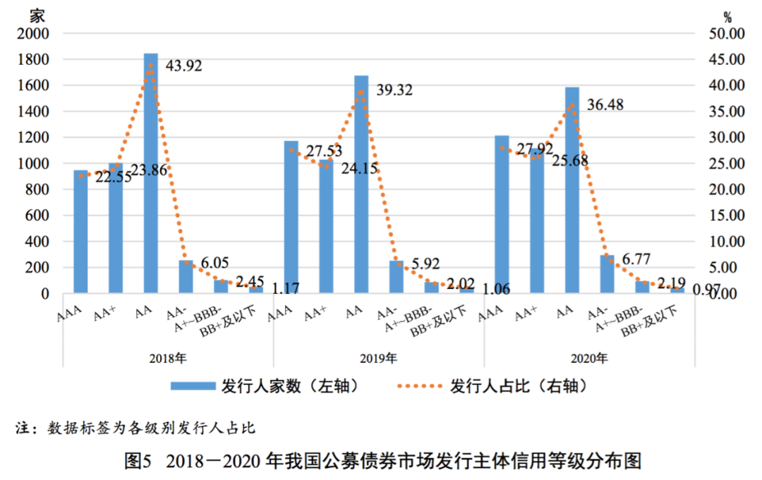 截至2020年末,我國公募債券市場發行主體信用等級主要集中在AA-級及以上級別,占比(96.85%)較2019年(96.92%)和2018年(96.38%)變化不大。其中,AA級發行人數量仍然最多但占比(36.48%)繼續下降,較2019年和2018年分別下降2.84個百分點和7.44個百分點;AAA級和AA+級發行人占比繼續上升,較2019年分別上升0.39個百分點和5.37個百分點,較2018年分別上升1.53個百分點和1.82個百分點。近年來我國債券市場違約常態化發生,弱資質、低級別發行人逐步出清,同時投資者風險偏好整體下行,新發行債券發行人的信用等級向高級別集中,市場信用等級中樞有所上移,截至2020年末高級別(AAA級和AA+級)占比進一步上升。