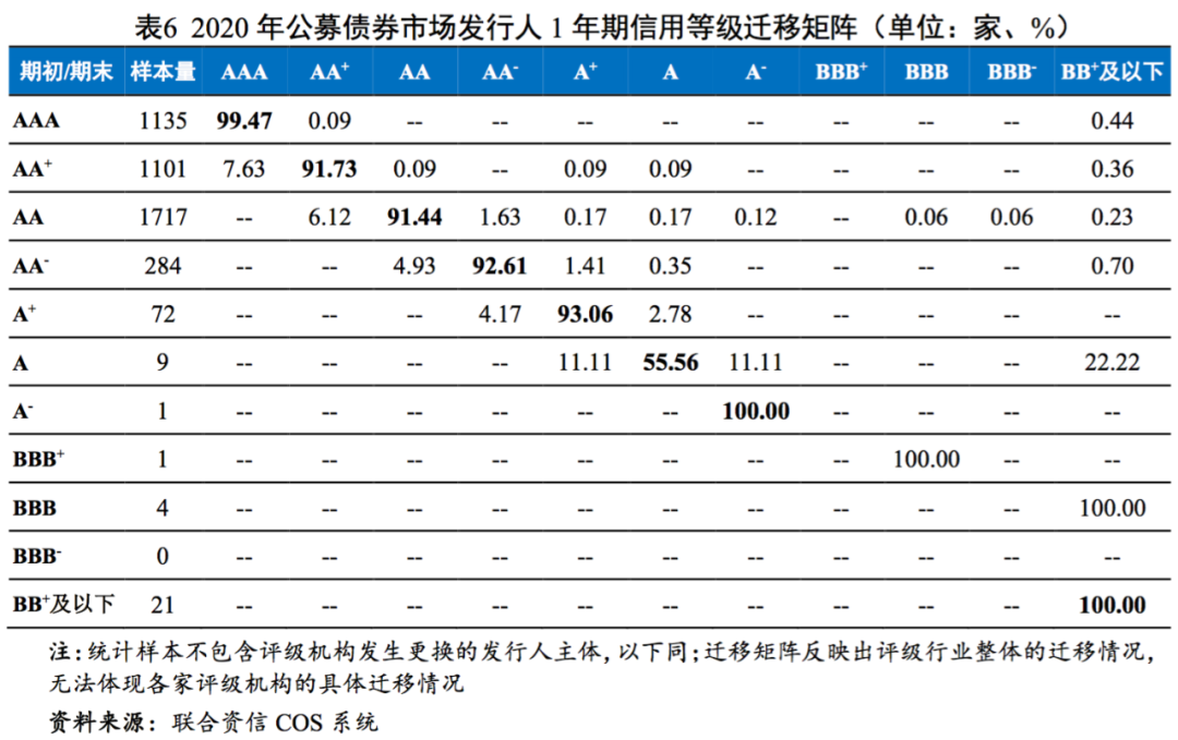 [9]信用等級遷移矩陣的計算方法采用Cohort法,即只對期初和期末均有效的發行人主體信用等級從期初到期末的變動情況進行統計,不包括統計期內新發和到期債券發行人主體信用等級的變動情況,亦不考慮期間等級多調和等級回調的情況。