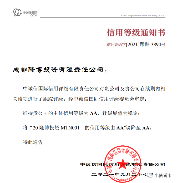 9月28日,中誠(chéng)信國(guó)際公告稱(chēng),維持成都隆博投資有限責(zé)任公司(以下簡(jiǎn)稱(chēng)“隆博投資”)的主體信用等級(jí)為AA,評(píng)級(jí)展望為穩(wěn)定,將“20隆博投資MTN001”的信用等級(jí)由AA+調(diào)降至AA。