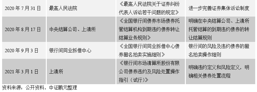 二是完善相關法律法規的建設?!豆痉ā泛汀蹲C券法》構成我國信用債券市場的基礎法律。近年隨著違約事件的頻發,違約處置相關的法規制度也在加速制定中,從法律定義、行政監管以及實際操作規范三個層次,搭建違約處置的基本框架(表1)。后續仍需在加強債券市場互通互聯、完善破產人管理制度、加大執法力度等方面繼續努力。