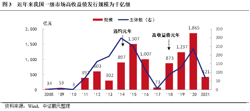 市場上通常將發行利差(票面利率與發行當日同期限國債收益率之差)>500BP的債券認定為高收益債,據此測算,當前我國高收益債年發行規模約為千億級(圖3),2021年因為高收益債的主要發行行業之一的房地產信用風險集中爆發,融資規模急劇收縮,因而2021年的高收益債發行規模同比大幅下降。