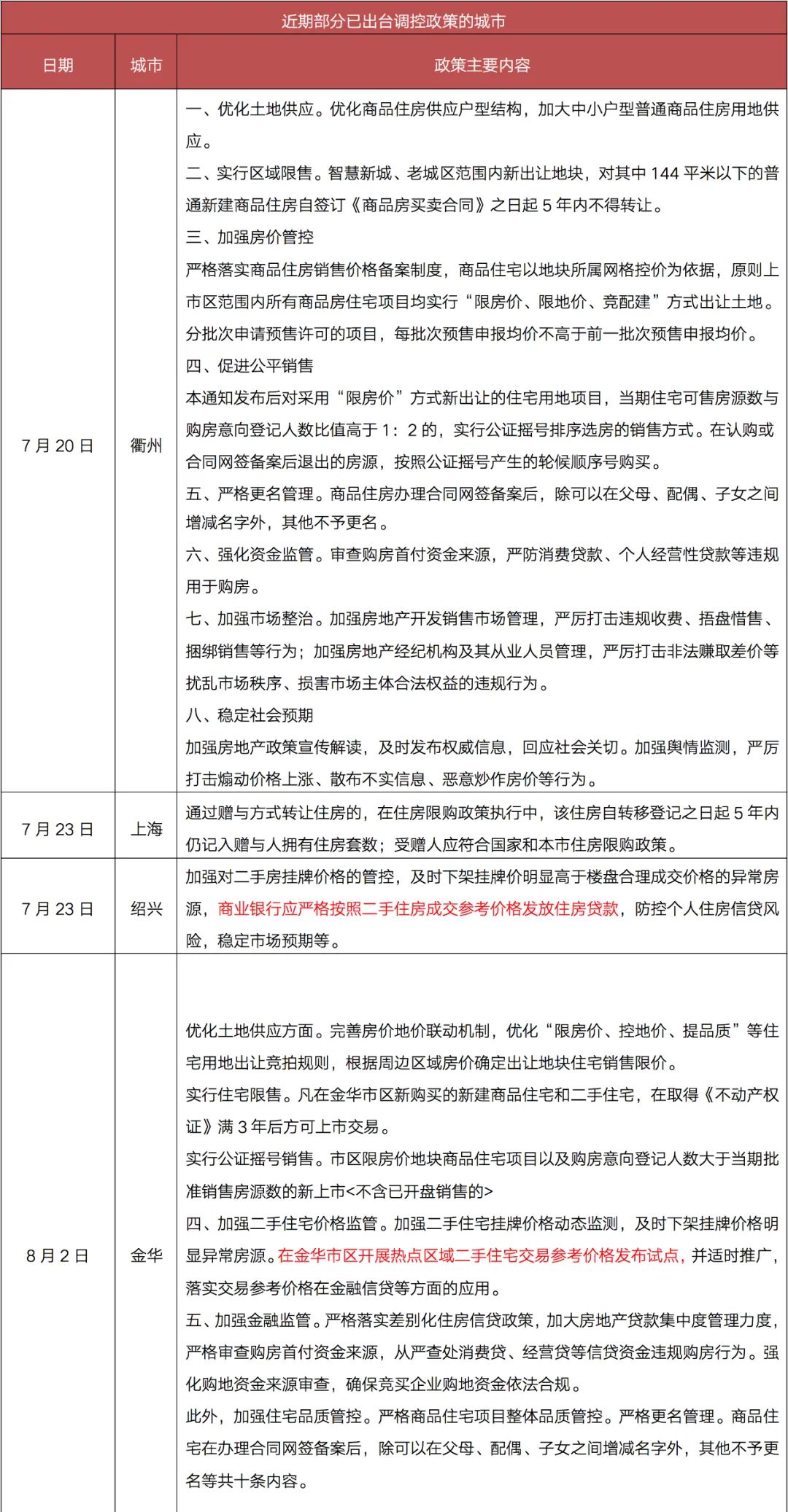 附圖:7月23日以來部分發(fā)布調控政策的城市及內容