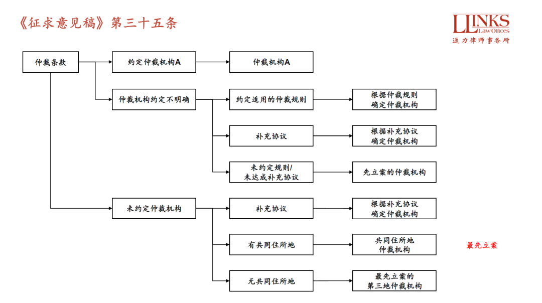 沒約定的, 共同住所地的仲裁機構受理, 此處《征求意見稿》雖然沒有言明, 但對于北京、上海這類有多個仲裁機構的城市, 其實依然暗含著最先立案的仲裁機構受理的情況;