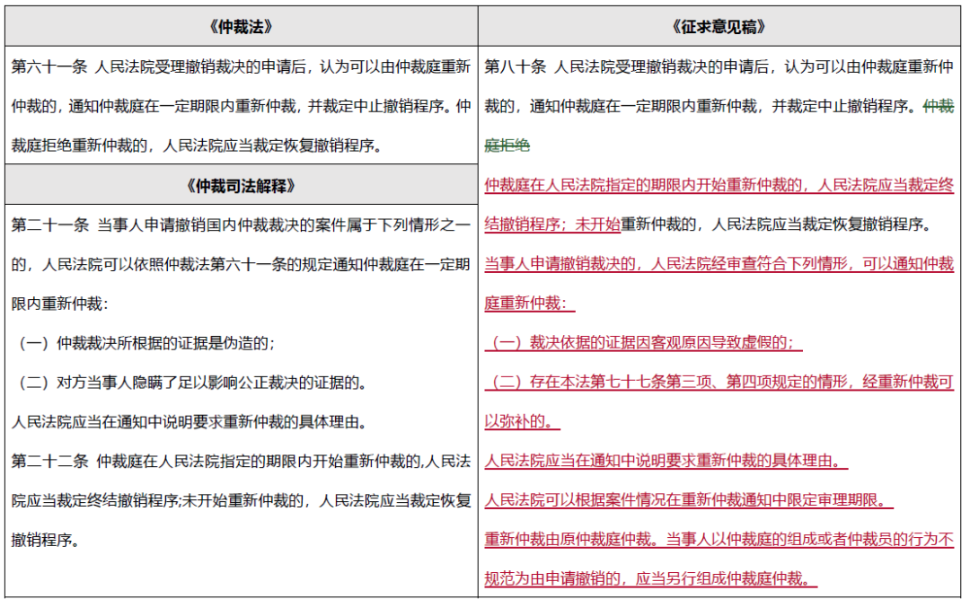 對比《最高人民法院關于適用<中華人民共和國仲裁法>若干問題的解釋》(“《仲裁司法解釋》”)和《征求意見稿》就可以發現, 《征求意見稿》對現行制度的修改包括: