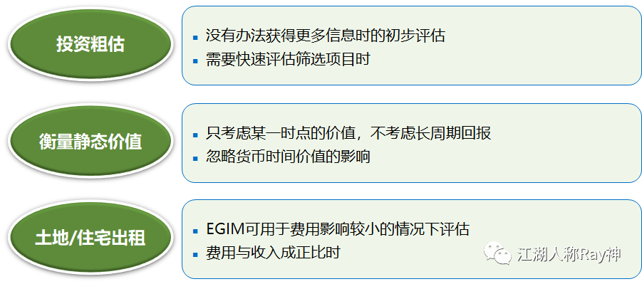 只不過,對適用范圍越廣的收益乘數,其所需要應用的收益指標的獲得難度必然也會增加許多。復雜度高了,收益乘數法估值也就失去其應用簡單快捷的優勢了。因此,在實際業務過程中,多數情況下還是會采取收益還原法來估值,并結合現金流折現的方式進行投資回報測算。特別是站在資管的角度,考慮到項目持續跟蹤的要求,往往都會依據于NOI進行測算和指標跟蹤。通常只會在投資收購時,應用GRM來對項目進行初步的篩選評估。