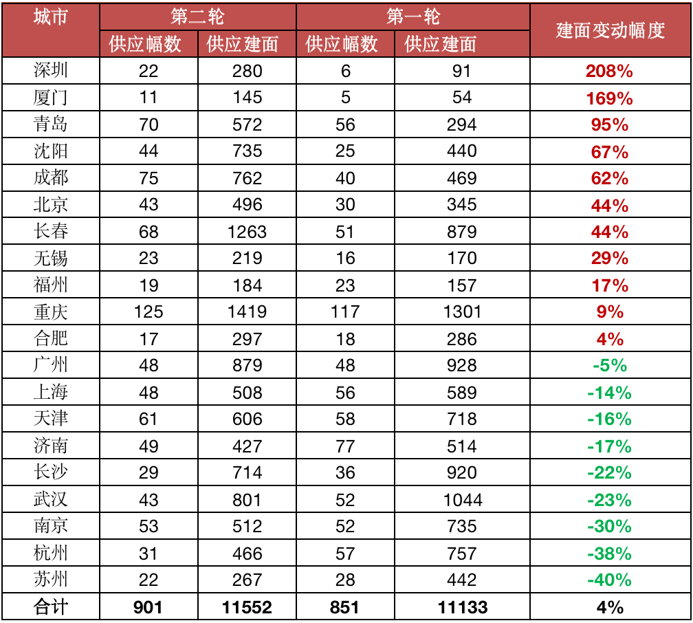 具體各城市間分化較為顯著。其中,蘇州、杭州、南京、武漢、長沙等城市第二輪供地規模較首輪明顯下滑,降幅均超20%;其他城市較首輪均有明顯上漲,尤其是深圳、廈門、青島等地,供應規模均實現翻番。