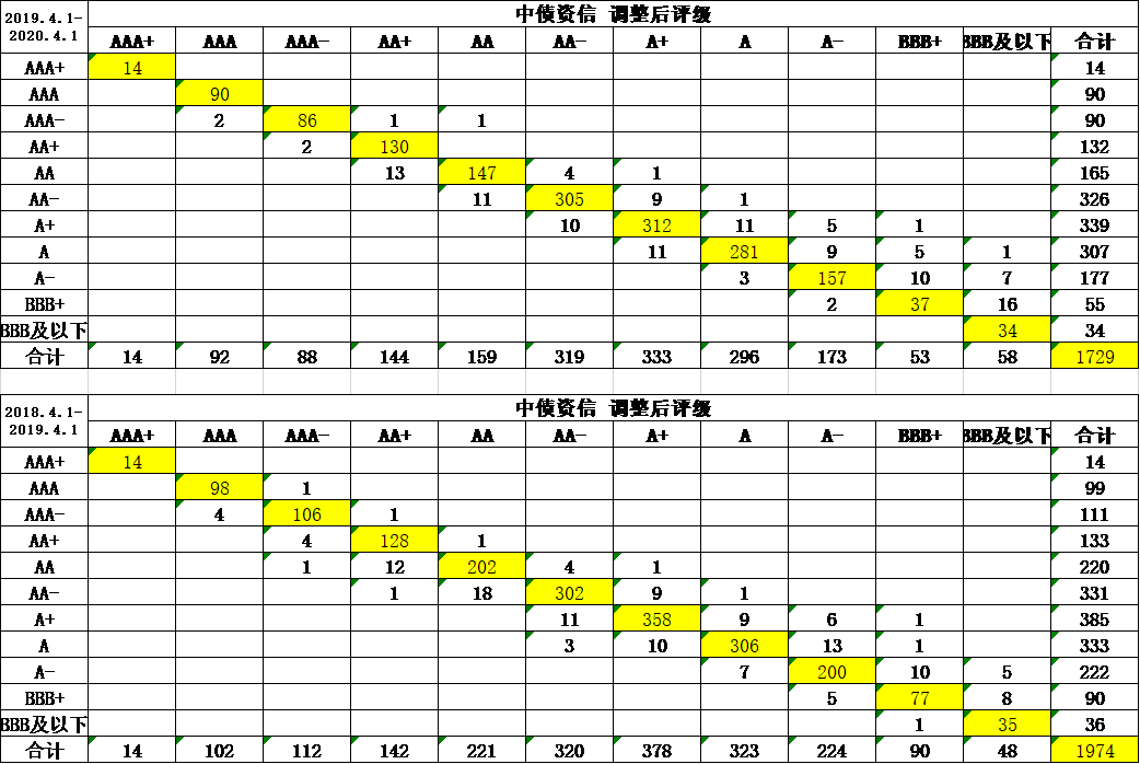 根據(jù)財匯金融大數(shù)據(jù)終端下載的主體評級遷移矩陣,中債資信在2018年4月1日至2019年4月1日,上調(diào)71次,下調(diào)46次,上調(diào)/下調(diào)比1.54;在2019年4月1日至2020年4月1日,上調(diào)52次,下調(diào)42次,上調(diào)/下調(diào)比1.24,比例沒有太夸張,并呈現(xiàn)收窄趨勢,風(fēng)險偏好相對謹慎,還算能用。