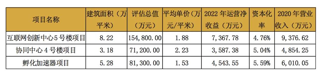 根據戴德梁行出具的估值報告,于2021年6月30日,標的基礎設施項目中互聯網創新中心5號樓、協同中心4號樓及孵化加速器估值分別為15.48億元、7.12億元及8.13億元。