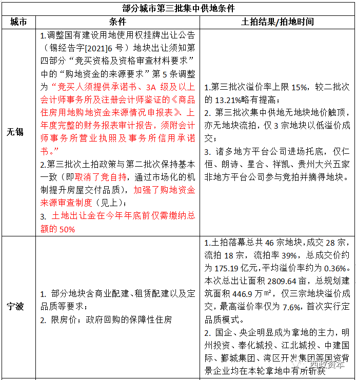全國各城市第三批集中供地開展以來,在已經完成土拍的城市中,國企托市現象依舊非常明顯(例如無錫、寧波等城市),但流拍的情況也依然頻繁,比如南昌此次推出的5宗土地中,有4宗被終止了交易,唯一有房企參拍的土地也是以流拍告終。我們注意到,盡管第三批集中供地的土拍中不少城市均不同程度地降低了拍地條件,但房企仍舊沒有什么參與的熱情,比如南京放寬了參拍企業的資質要求(降低對聯合開發的限制,企業拿地資質由一級或二級降至三級)、不設置報名競買、合作開發和股份轉讓要求;蘇州下調了保證金和首付款比例、取消了土地的市場指導價、降低首繳土地出讓金比例;廣州南沙、黃埔取消限價政策,之前流拍的土地也下調了地價,允許開發商“分期付款”(詳見文末附圖)……