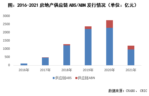 近幾年隨著房地產融資渠道如銀行信貸、私募資管計劃、委托貸款、銀信合作和海外債等的步步收緊,供應鏈融資越來越成為企業補充資金來源的重要方式,特別是三條紅線以來,該方式可以有效幫助房企降低有息債杠桿。從2018年開始房地產供應鏈ABS/ABN發行呈井噴式增長,2020年發行量達到2753億元,較2016年五年復合增長率達到126%。