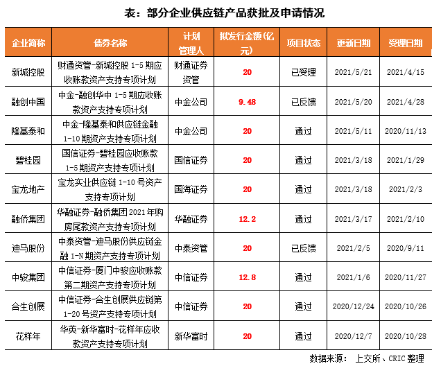 在2020年監管窗口指導中,保理形式的資產證券化產品申請儲架發行,制造業企業ABS儲架額度最高可到100億元,房地產供應鏈類ABS儲架規模被降至20億元,且新申請儲架發行已經很難獲批。該窗口指導在企業的申請情況中可以窺見,根據上交所備案數據,近期房地產企業申請的供應鏈產品額度最高為20億元,碧桂園、隆基泰和、寶龍等近期通過的供應鏈資產支持計劃額度均為20億元。