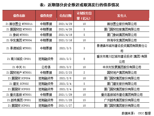 與此同時,2020年以來企業信用債暴雷頻發,且逐步波及到排名較前的中大型房企,從而引發債券市場動蕩。截止2021年5月26日,房企債券違約金額約達296.78億元,較2020年增長56%,在此情況下,疊加融資收緊的政策壓力,債券市場近期較為動蕩,首創、廈門國貿等近期取消了多筆中期票據以及融資券的發行,企業信用債融資也受到較大的影響。而海外融資受近期境內債違約、美元上調、海外疫情等多重因素的影響,房企境外發債較少,截止4月底的發行量占總債券的48%,比2020年同期低潮期還低2個百分點。