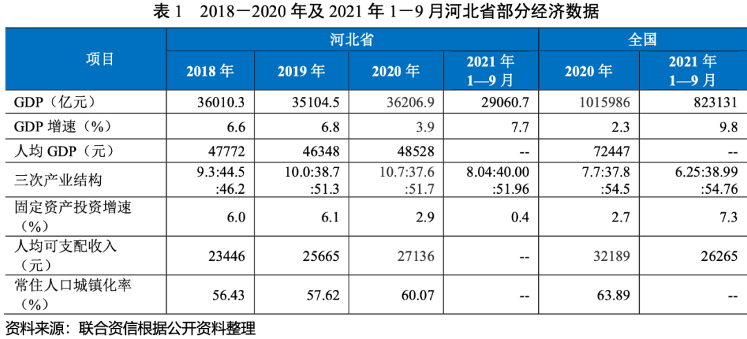 河北省經(jīng)濟(jì)發(fā)展基礎(chǔ)較好,經(jīng)濟(jì)總量在全國排名中游,但人均地區(qū)生產(chǎn)總值在全國排名靠后。受鋼鐵、煤炭、石化等傳統(tǒng)支柱產(chǎn)業(yè)化解過剩產(chǎn)能及節(jié)能減排等政策影響,經(jīng)濟(jì)增長面臨一定壓力。2021年前三季度,河北省各主要經(jīng)濟(jì)指標(biāo)保持增長,但增速不及全國平均水平。