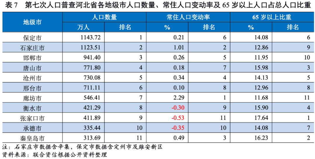 從人口數(shù)量看,河北省下轄地級市人口規(guī)模差異明顯。根據(jù)第七次人口普查結(jié)果,保定市及石家莊市人口數(shù)量超過1000萬人,邯鄲市人口數(shù)量達(dá)941.40萬人,顯著高于其他地級市,上述地級市合計人口數(shù)量占河北省總?cè)丝跀?shù)量的43.01%。唐山市、滄州市、邢臺市人口數(shù)量均在700~800萬人區(qū)間,其余地級市人口數(shù)量少于600萬人,秦皇島市人口數(shù)量最少,僅為313.69萬人。