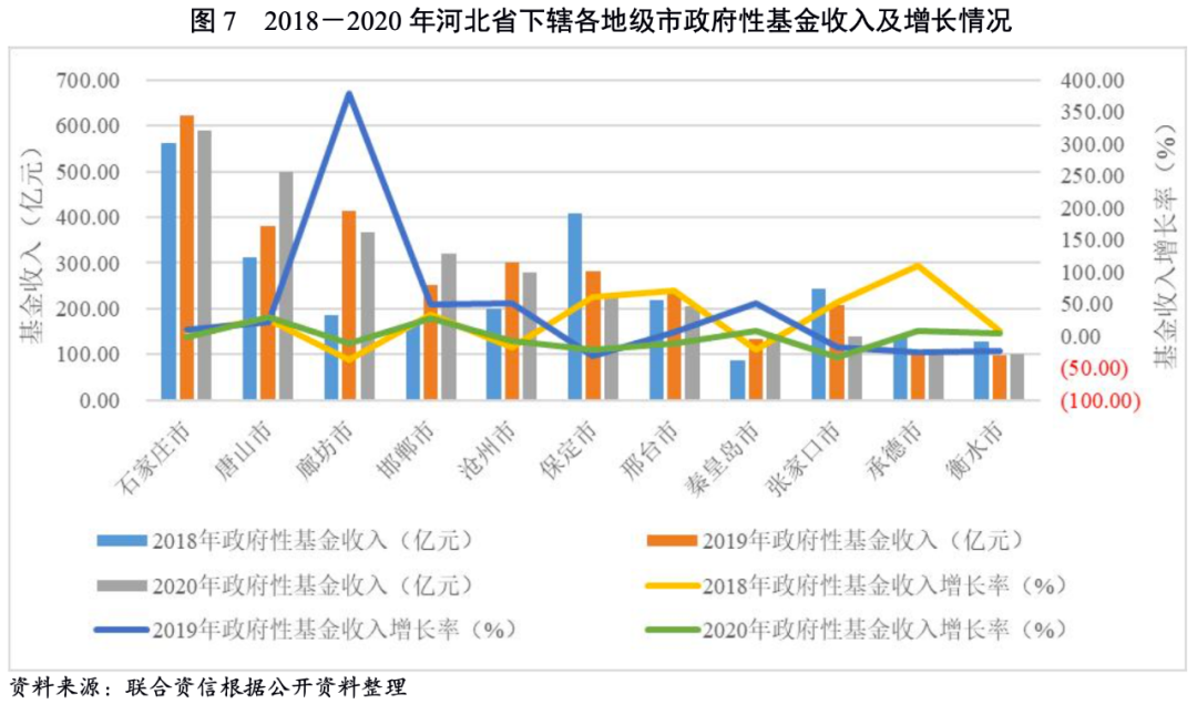 政府性基金收入方面,受土地和房地產(chǎn)市場景氣度波動影響,河北省下轄各地級市政府性基金收入整體波動大,其中唐山市和邯鄲市連續(xù)三年保持增長。具體看,2020年,石家莊市政府性基金收入規(guī)模最大,為588.20億元,占全省比重為18.58%;唐山市增幅最快,2020年增速達(dá)30.50%,政府性基金收入規(guī)模為498.46億元,位列全省第2位;保定市和張家口市政府性基金收入持續(xù)下降,衡水市和承德市政府性基金收入規(guī)模較小。