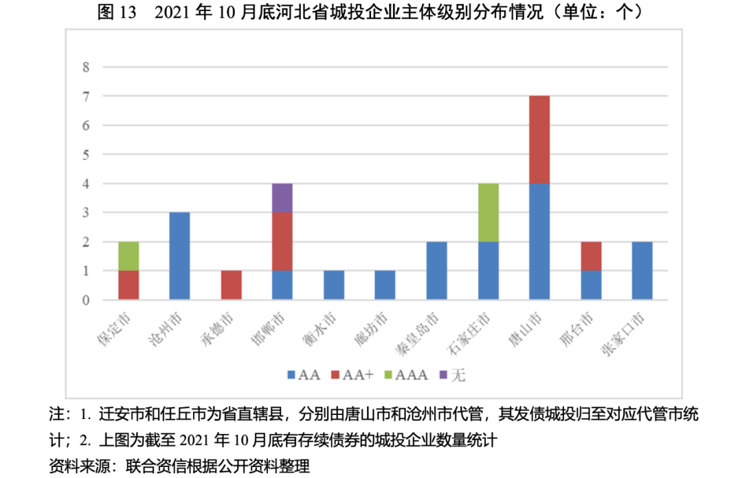 截至2021年10月底,河北省有存續(xù)債的城投企業(yè)共29家,其中省級城投企業(yè)1家,市級城投企業(yè)16家,區(qū)縣級城投企業(yè)11家,國家級新區(qū)城投企業(yè)1家。河北省下轄11個地級市均有發(fā)債城投企業(yè)[1],其中,唐山市7家,石家莊市4家,邯鄲市4家,滄州市3家,保定市、邢臺市、秦皇島市和張家口市各2家,承德市、衡水市和廊坊市各1家。