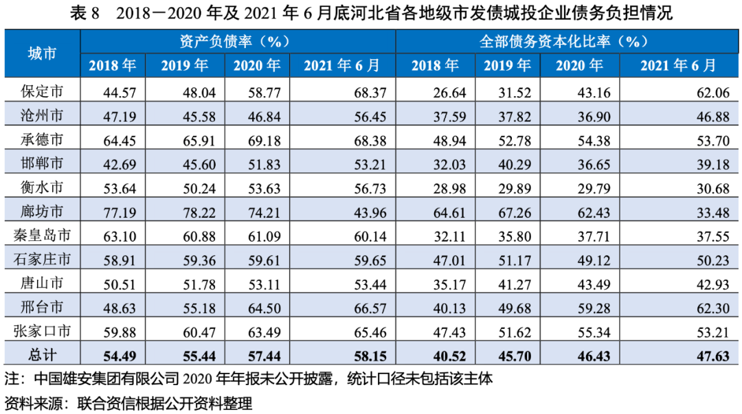 2020年,河北省發(fā)債城投企業(yè)債務(wù)負(fù)擔(dān)進(jìn)一步加重,其中張家口市、邢臺市、保定市和承德市的發(fā)債城投企業(yè)債務(wù)負(fù)擔(dān)較重,唐山市的發(fā)債城投企業(yè)未來三年到期債券規(guī)模較大,秦皇島市、滄州市、唐山市的短期償債壓力相對較大。