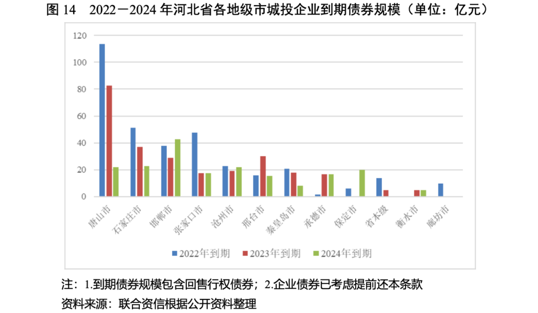 張家口市和石家莊市“發(fā)債城投企業(yè)全部債務(wù)+地方政府債務(wù)”/GDP的比值較高,唐山市、石家莊市、承德市、張家口市和秦皇島市地方政府財政收入對“發(fā)債城投企業(yè)全部債務(wù)+地方政府債務(wù)”覆蓋程度相對較低,需關(guān)注面臨集中償付壓力和地區(qū)債務(wù)負(fù)擔(dān)重的地級市的城投企業(yè)的再融資情況。