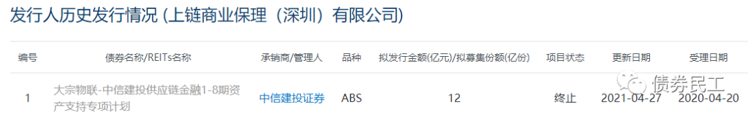 5、大宗物聯(lián)-中信建投供應(yīng)鏈金融1-8期資產(chǎn)支持專項計劃擬發(fā)行規(guī)模為12億元,發(fā)行人為上鏈商業(yè)保理(深圳)有限公司,此前未申報過ABS產(chǎn)品。