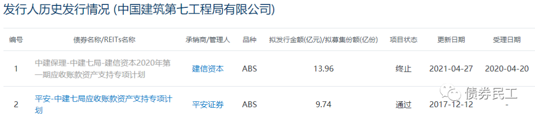 4、中建保理-中建七局-建信資本2020年第一期應(yīng)收賬款資產(chǎn)支持專項計劃擬發(fā)行規(guī)模為13.96億元,發(fā)行人為中國建筑第七工程局有限公司,此前申報過一單ABS產(chǎn)品:2017年申報的總額為9.74億元的產(chǎn)品通過。