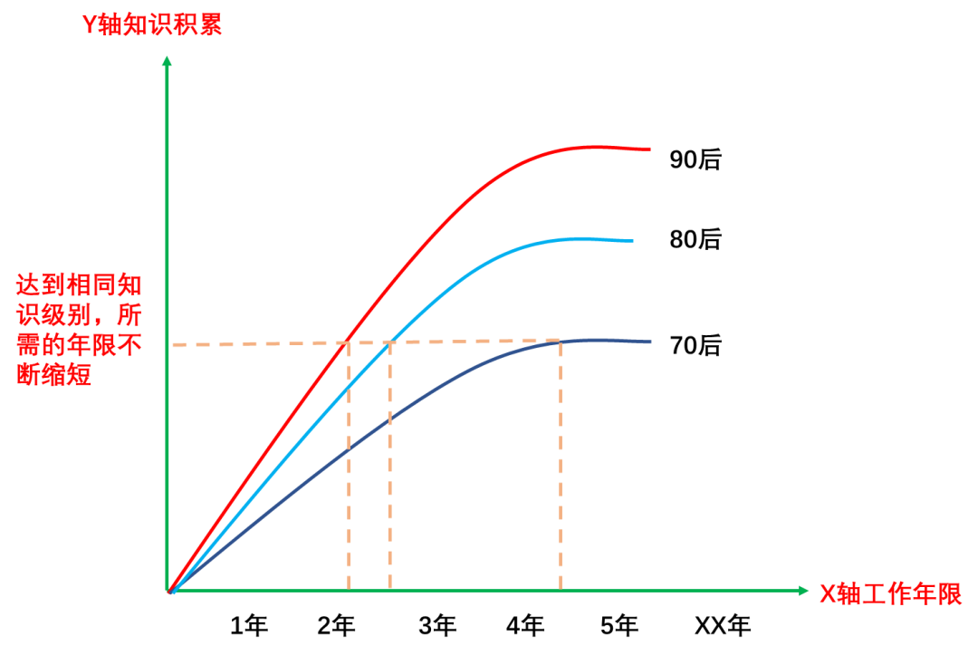 嘗試用下圖總結這個現象,年輕人的知識積累曲線越來越陡峭,達到相同知識存量所需要的時間要比前幾代人短的多,所以職場對年輕人的期望也水漲船高。