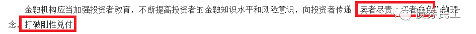 目前監(jiān)管機構(gòu)對非標產(chǎn)品剛性兌付問題指導意見最明確的文件是人民銀行、銀保監(jiān)會、證監(jiān)會和外匯局于2018年聯(lián)合印發(fā)的《關(guān)于規(guī)范金融機構(gòu)資產(chǎn)管理業(yè)務(wù)的指導意見》(銀發(fā)[2018]106號)(以下簡稱“指導意見”)。指導意見明確提出了要打破剛性兌付。需要注意的是,指導意見中的剛性兌付的內(nèi)涵實際上是包括兩個方面的內(nèi)容:一是賣者盡責,二是買者自負。也就是說金融機構(gòu)需要放棄剛性兌付的包袱,而投資者則需要接受投資所帶來的潛在風險。