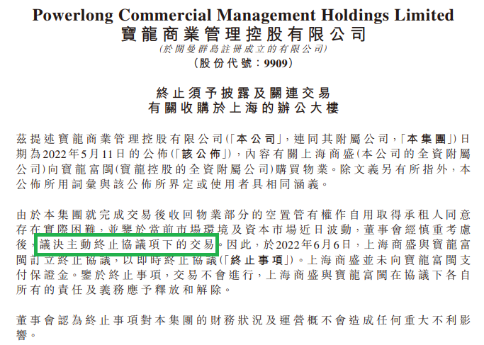 表述太復雜,杠桿地產翻譯成一句話,寶龍商業終止收購寶龍控股旗下上海辦公樓宇。