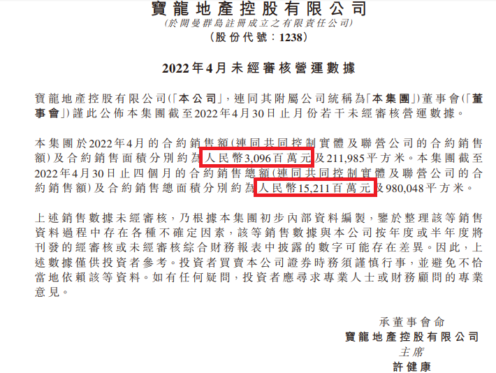 目前(截至2022年6月8日下午13點),寶龍地產尚未披露5月銷售數據。