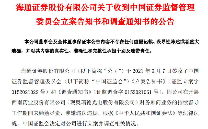 主要原因在于海通證券在開展西南藥業(yè)股份有限公司(現(xiàn)奧瑞光電股份有限公司)財(cái)務(wù)顧問業(yè)務(wù)的持續(xù)督導(dǎo)工作期間,未能勤勉盡責(zé),涉嫌違法違規(guī)決定,對(duì)其進(jìn)行立案調(diào)查。
