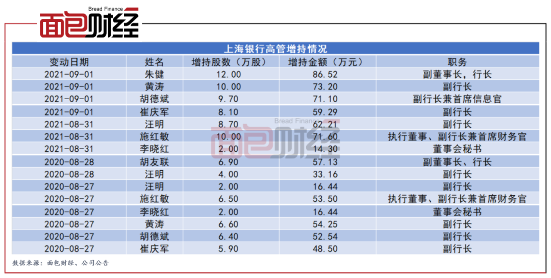2021年9月初,上海銀行發(fā)布高管買入公司股票公告。根據(jù)上交所信披數(shù)據(jù)計算,包括行長、副行長在內(nèi)的7位高管分別于2021年8月31日至9月1日期間以自有資金從二級市場買入公司A股股票,合計增持60.5萬股,合計增持金額約為438.21萬元。