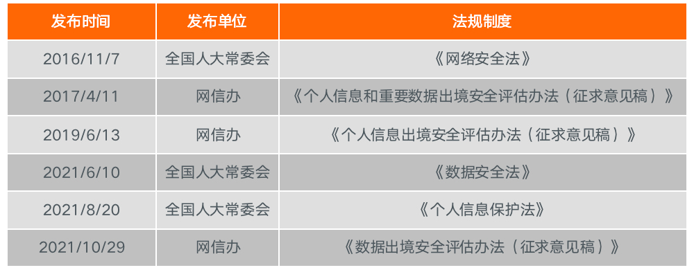 2016年11月7日,《網絡安全法》正式頒布,首次明確了數據出境需進行安全評估。之后,網信辦分別于2017年和2019年發布了《個人信息和重要數據出境安全評估辦法(征求意見稿)》和《個人信息出境安全評估辦法(征求意見稿)》,但由于《數據安全法》和《個人信息保護法》尚未實施,以上兩個評估辦法缺乏法律基礎,一直未出臺正式文件。