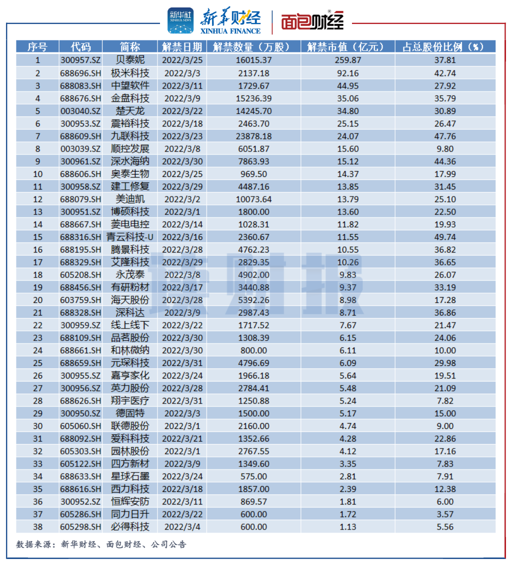 此外,共有38家公司于3月迎上市周年解禁,合計解禁量約為16.29億股,解禁市值約為757億元。