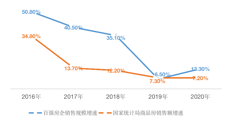 圖:2016年-2020年百強(qiáng)房企及行業(yè)增速(銷售金額)