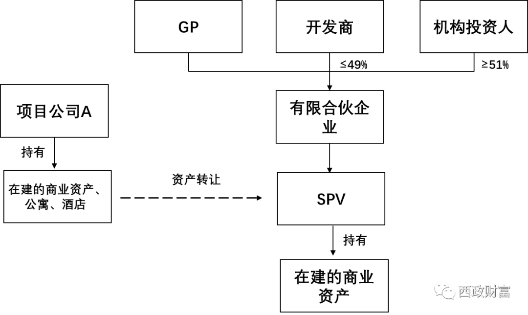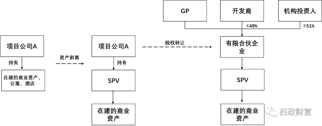1. 機(jī)構(gòu)投資人與開(kāi)發(fā)商共同成立合伙企業(yè),其中機(jī)構(gòu)投資人持股51%以上,并由合伙企業(yè)設(shè)立SPV,SPV從項(xiàng)目公司A處資產(chǎn)收購(gòu)在建的商業(yè)資產(chǎn),將資產(chǎn)予以單獨(dú)剝離。不過(guò)需注意直接資產(chǎn)轉(zhuǎn)讓所應(yīng)承擔(dān)的稅費(fèi)問(wèn)題。