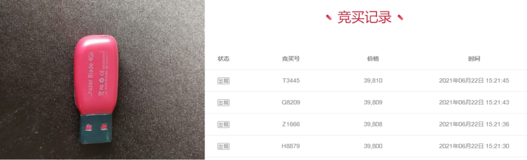 但6月21日結(jié)束時(shí),該U盤(pán)的競(jìng)買(mǎi)價(jià)格已升至1512元。而截至6月22日15時(shí)21分45秒,即拍賣(mài)中止前,該U盤(pán)的拍賣(mài)價(jià)格更是高達(dá)39810元,共有1186次競(jìng)買(mǎi),總計(jì)吸引了超29萬(wàn)次圍觀。