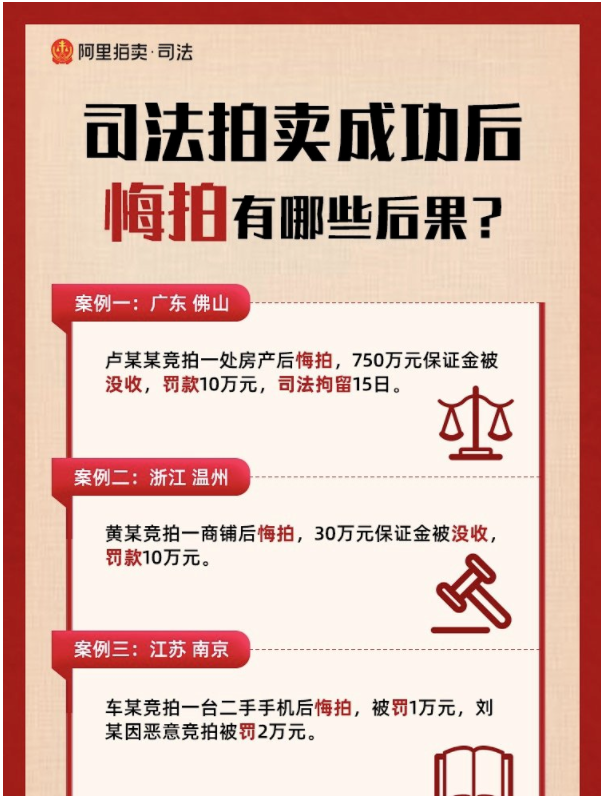 雷達(dá)財(cái)經(jīng)注意到,阿里拍賣(mài)的提示中,此前有競(jìng)拍人毀約,被司法拘留15日,并罰款10萬(wàn)元。