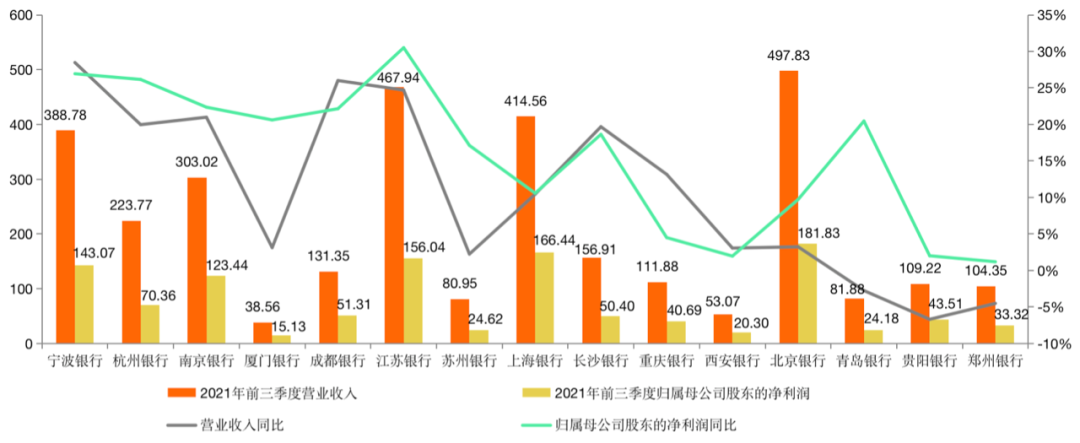 一、城商行業(yè)績(jī)PK:寧波銀行營業(yè)收入同比最高,保持穩(wěn)健發(fā)展縱觀15家A股上市城商行,2021年前三季度的整體業(yè)績(jī)表現(xiàn)為正增長(zhǎng),呈現(xiàn)出逐步擺脫疫情影響的良好經(jīng)營態(tài)勢(shì)。零壹智庫選取營業(yè)收入與歸母公司凈利潤2項(xiàng)指標(biāo),綜合觀察城商行之間的業(yè)績(jī)表現(xiàn):