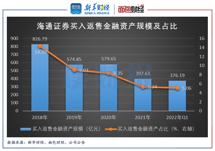 2022年一季末,海通證券的買入返售金融資產(chǎn)為376.19億元,較上年年末下降5.39%。2018年以來,公司的買入返售金融資產(chǎn)規(guī)模及占總資產(chǎn)的比例整體呈下滑趨勢,公司或意欲控制該業(yè)務(wù)所帶來的信用風(fēng)險。