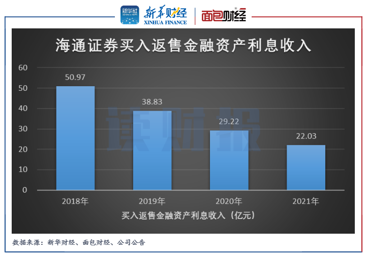 由于買入返售金融資產(chǎn)規(guī)模的縮減,海通證券由此產(chǎn)生利息收入相應(yīng)減少。2021年,公司買入返售金融資產(chǎn)利息收入為22.03億元,同比減少24.61%。