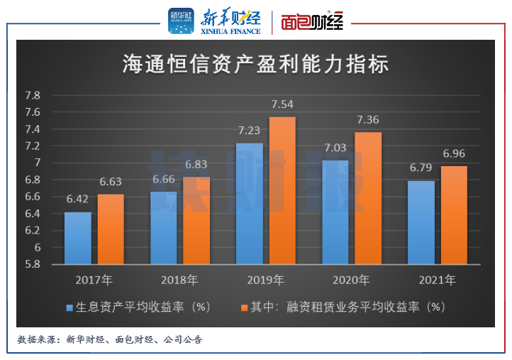 研究發(fā)現(xiàn),海通證券融資租賃子公司海通恒信的資產(chǎn)盈利能力有所下滑。2021年,該公司的生息資產(chǎn)平均收益率和融資租賃業(yè)務(wù)平均收益率分別為6.79%和6.96%,同比分別下降0.24個百分點(diǎn)和0.4個百分點(diǎn)。