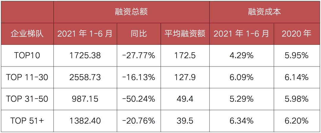 截至2021年6月,100家典型房企新增債券類(lèi)融資成本為5.59%,較2020年下降0.48個(gè)百分點(diǎn),其中境外債券融資成本達(dá)6.86%,下降0.97個(gè)百分點(diǎn),境內(nèi)債券融資成本4.40%,較2020年下降0.03個(gè)百分點(diǎn)。