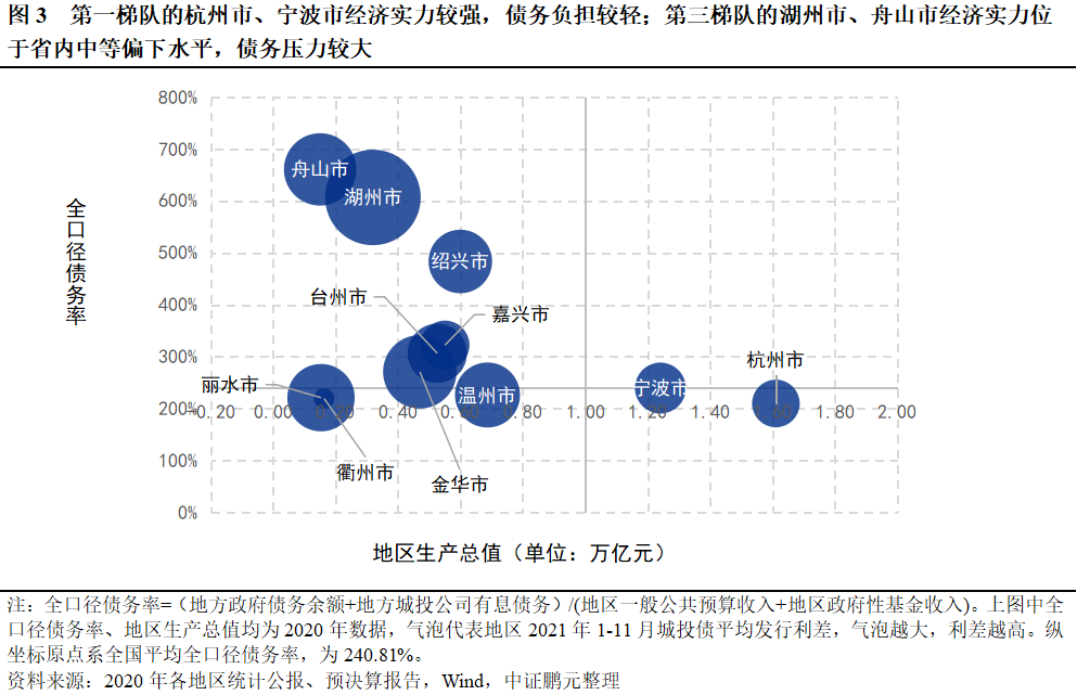 從地區(qū)經(jīng)濟(jì)財(cái)政角度來看,第一梯隊(duì)的杭州市、寧波市、嘉興市、衢州市中,除衢州市外,其余地市經(jīng)濟(jì)總量位居省內(nèi)前列,寧波市、杭州市、衢州市全口徑債務(wù)率相對(duì)較低,嘉興市債務(wù)負(fù)擔(dān)偏重;第二梯隊(duì)的臺(tái)州市、紹興市、溫州市經(jīng)濟(jì)總量位于省內(nèi)中等偏上水平,但全口徑債務(wù)率表現(xiàn)不一,紹興市債務(wù)率偏高;第三梯隊(duì)的舟山市、麗水市、湖州市、金華市經(jīng)濟(jì)實(shí)力位于省內(nèi)中等偏下水平,舟山市、湖州市全口徑債務(wù)率較高,債務(wù)壓力較大,麗水市、金華市債務(wù)負(fù)擔(dān)一般。