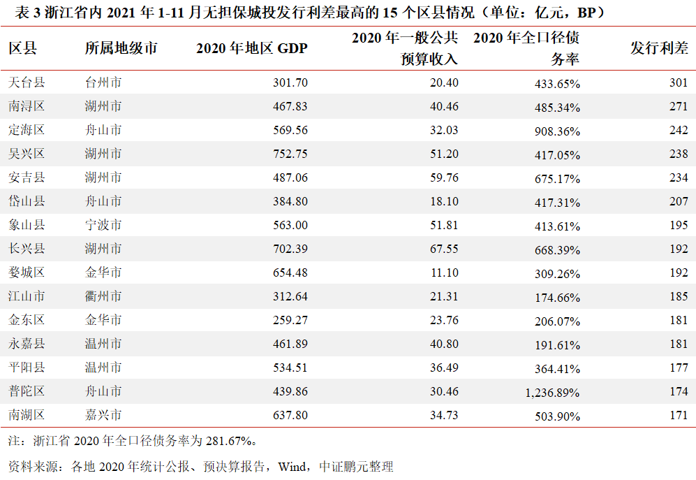 下文列示了2021年1-11月浙江省內(nèi)無擔(dān)保城投發(fā)行利差最高的15個(gè)區(qū)縣情況,這些區(qū)縣主要位于湖州市、舟山市、金華市、溫州市等地,地區(qū)GDP多在600億元以下,一般公共預(yù)算收入在40億元左右及以下區(qū)間的地區(qū)較多,且全口徑債務(wù)率普遍較高,舟山市的定海區(qū)、普陀區(qū)債務(wù)率畸高。